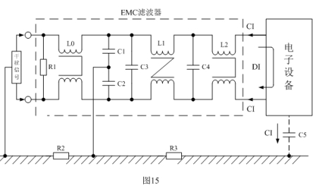 圖15與圖14相比,多了一個L0低通電感濾波器,目的是為了提高對外來傳導(dǎo)干擾信號的抑制能力。如果只考慮提高抑制本電子設(shè)備干擾的能力,可把C1、C2的連接位置移放到電源線的最前端,即:盡量靠近測試儀表的接入處,抑制干擾效果會更顯著。需要檢查電子設(shè)備對外來電磁干擾信號的抑制能力,可在電源線輸入端輸入一個干擾信號,然后檢測電子設(shè)備被干擾影響的程度,如:電視機(jī)出現(xiàn)行掃描不同步等。對不同的電子設(shè)備,干擾信號也有不同的要求,這些標(biāo)準(zhǔn)制定一般都是由行業(yè)協(xié)會提出,最后由標(biāo)準(zhǔn)制定單位推薦使用。
