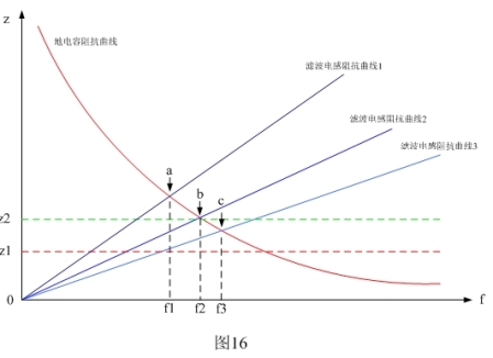 圖16表示C5電容與L0、L1、L2等電感濾波器的頻率-阻抗特性圖。圖16中紅線表示設(shè)備對地電容C5的頻率阻抗曲線;藍(lán)線是濾波電感L0、L1、L2的頻率阻抗曲線。