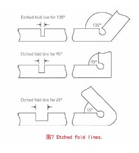 PCM有一些優(yōu)點(diǎn),加工和工具修改花費(fèi)較低,整個(gè)過(guò)程所需要的時(shí)間較短。彎線可以被很精確的蝕刻出來(lái),例如,135,90或者45度,如圖7。整個(gè)過(guò)程沒(méi)有毛邊和金屬應(yīng)力,磁和其他金屬特性不變。可以很方便的用于復(fù)雜的設(shè)計(jì),產(chǎn)品有縫,軌道限界孔,徽標(biāo)和其他細(xì)節(jié)不會(huì)增加最后的費(fèi)用,這可以使設(shè)計(jì)者隨意設(shè)計(jì)他們想要的東西。