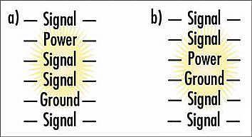 如果同一電壓源的兩個(gè)電源層需要輸出大電流,則電路板應(yīng)布成兩組電源層和接地層。在這種情況下,每對(duì)電源層和接地層之間都放置了絕緣層。這樣就得到我們期望的等分電流的兩對(duì)阻抗相等的電源匯流排。如果電源層的堆疊造成阻抗不相等,則分流就不均勻,瞬態(tài)電壓將大得多,并且EMI會(huì)急劇增加。