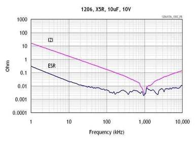 LDO需要增加外部輸入和輸出電容器。利用較低ESR的大電容器一般可以全面提高電源抑制比(PSRR)、噪聲以及瞬態(tài)性能。陶瓷電容器通常是首選,因為它們價格低而且故障模式是斷路,相比之下鉭電容器比較昂貴且其故障模式是短路。輸出電容器的等效串聯(lián)電阻(ESR)會影響其穩(wěn)定性,陶瓷電容器具有較低的ESR,大概為10mΩ量級采用陶瓷電容時,建議使用X5R和X7R電介質材料,這是因為它們具有較好的溫度穩(wěn)定性。圖為X5R的ESR和頻率曲線。
