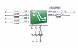 從圖12所示的輸入阻抗特性曲線可以看出:在加入旁路電容之后,在低頻段,電源的輸入阻抗特性已經(jīng)有了很大的改善,但是在高頻時仍有一些頻段超標(biāo)。從阻抗特性上可以看到在高頻段,阻抗已經(jīng)呈現(xiàn)電感的特性,因此高頻段的超標(biāo)極有可能是由于電容的寄生電感的造成的。為此可以考慮選用質(zhì)量更好的電容。這里,選用的電容的寄生電感為25pH,仿真電路如圖13所示。