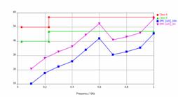 對于電子產(chǎn)品的電磁輻射,國際電工委(IEC:InternationalElectrotechnicalCommission)制定了強(qiáng)制標(biāo)準(zhǔn)。通常,印制板都只是系統(tǒng)中的一部分,在進(jìn)行電磁輻射分析的時候除了要考慮印制板本身的輻射問題外,還需要考慮系統(tǒng)中其它設(shè)備對對電磁輻射的影響,尤其是帶有通風(fēng)孔機(jī)箱的屏蔽效能。CST印制板工作室在進(jìn)行SI仿真的同時,可以得到印制板上電流分布的幅度和相位信息,并通過與CST微波工作室的協(xié)同將該電流分布作為激勵源,然后再加上機(jī)箱,充分考慮孔、縫對電磁輻射的影響。仿真的結(jié)果自動與內(nèi)嵌的EMC國際標(biāo)準(zhǔn)限值進(jìn)行對比,如圖16所示。
