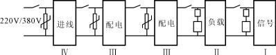 依據(jù)線路絕緣結(jié)構(gòu)理論及IEC61312、IEC664-1、IEC61643、GB50097-1994(2000年版)等標(biāo)準(zhǔn),對建筑物和電氣設(shè)備(如第三類防雷建筑物)進(jìn)行感應(yīng)過電壓防護(hù)的絕緣結(jié)構(gòu),如圖1所示。
