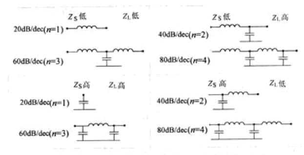 EMC設(shè)計中的濾波器通常指由L,C構(gòu)成的低通濾波器。濾波器結(jié)構(gòu)的選擇是由"最大不匹配原則"決定的。即在任何濾波器中,電容兩端存在高阻抗,電感兩端存在低阻抗。圖1是利用最大不匹配原則得到的濾波器的結(jié)構(gòu)與ZS和ZL的配合關(guān)系,每種情形給出了2種結(jié)構(gòu)及相應(yīng)的衰減斜率(n表示濾波器中電容元件和電感元件的總數(shù))。