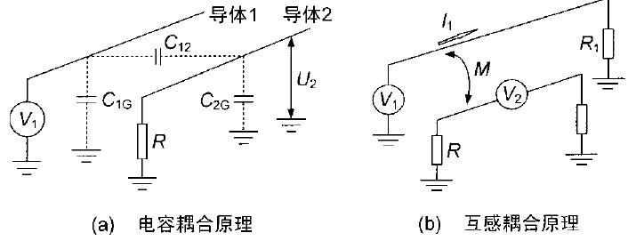 當(dāng)一根導(dǎo)線(xiàn)上存在電壓或有電流流過(guò)時(shí), 就會(huì)有電磁能量輻射出來(lái), 到達(dá)附近的導(dǎo)線(xiàn)上, 這就是導(dǎo)線(xiàn)之間的串?dāng)_。串?dāng)_屬于近場(chǎng)的感應(yīng)耦合, 原因是導(dǎo)線(xiàn)之間存在雜散電容和互感, 即電容耦合和互感耦合, 如圖1 所示。