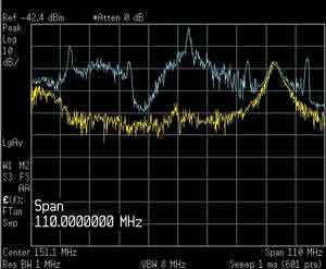 幸運的是,測量技術(shù)的發(fā)展已經(jīng)可以滿足這些需求。上面介紹了如何使用實時頻譜分析儀發(fā)現(xiàn)瞬態(tài)信號和EMI隱患。在下面的實例中,單個的瞬態(tài)信號會產(chǎn)生一串瞬態(tài)信號,這些信號每次只持續(xù)很短的時間。在本例中,該設(shè)備是一種嵌入式系統(tǒng),在把數(shù)據(jù)緩存到硬盤時導致了瞬態(tài)EMI.在使用掃頻分析儀的峰值檢波器簡單檢查后(黃色軌跡,如圖6所示),似乎只有一個連續(xù)信號;把儀器保持Max-hold幾分鐘,同時循環(huán)DUT工作模式,會指明問題(藍色軌跡)。但在峰值檢波模式下進行快速掃描會得到黃色軌跡,沒有檢測到問題。