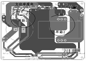 對于元器件的放置,由于開關(guān)電源的輻射干擾(E)與電流通路中電流(I)的大小,通路的環(huán)路面積(A),以及電流頻率(f)的平方等三者的乘積成正比,即E=I·A·f2。運用這一關(guān)系的前提是通路尺寸遠小于頻率的波長(此電路符合條件)。
