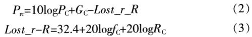 設(shè)發(fā)射系統(tǒng)的發(fā)射功率為Pc,單位為W;發(fā)射天線增益為Gc,單位為dB;發(fā)射距離為Rc,單位為km;信號傳輸損耗為Lost_r_R,單位為dB;信號頻率為fc,單位為MHz。發(fā)射信號到達(dá)接收系統(tǒng)的功率為: