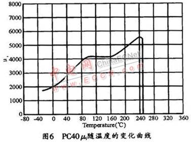 中小功率的EMI濾波器產(chǎn)品中選用最多的磁芯材料是日本TDK公司 的PC40 (它是目前業(yè)界廣泛使用的較好的材料之一),它的初始磁導(dǎo)μi隨溫度的變化曲線如圖6所示。從圖中可看出,溫度變化對μi的影響是很大的,磁芯溫度在 90~150℃的區(qū)間內(nèi),有一段平坦區(qū),這時它的μi大約在4100左右;當(dāng)溫度低于90℃后,μi值會隨著溫度的降低而逐漸減小,到0℃時,μi值只有 2000左右,進(jìn)到負(fù)溫區(qū)后,μi值還會進(jìn)一步減??;而當(dāng)溫度高于150℃后,μi值則會隨著溫度的升高而增加,當(dāng)達(dá)到240℃時,μ的最大值為5600 左右;從240℃開始,μi值又漸漸減小,當(dāng)溫度達(dá)到居里溫度點(diǎn)250℃時,材料失去磁性。