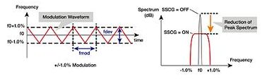 某一大型半導(dǎo)體廠商在解串器的并行總線上實現(xiàn)了SSCG功能。SSCG功能能夠通過將輻射峰值能量擴展到更寬的頻帶上來減少輻射。如下面的圖1所示,頻率變化發(fā)生在額定時鐘中心頻率(中心擴頻調(diào)制)附近,擴展的頻譜為正或負1.0%(fdev)。在接收器并行總線端,輸出以千赫茲(fmod)的調(diào)制速率隨時間調(diào)制時鐘頻率和數(shù)據(jù)頻譜。定制的串行解串器芯片組的目標(biāo)客戶是要求所安裝電子設(shè)備具有低EMI輻射特性的汽車廠商。