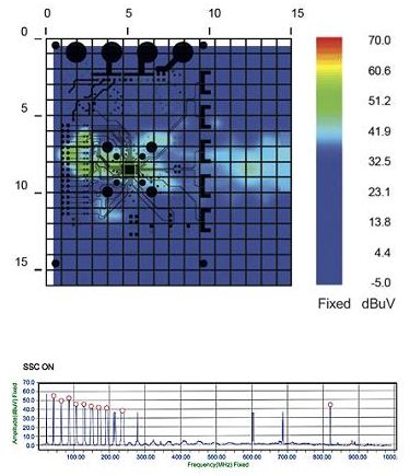 該公司期望用令人信服的量化證據(jù)來向汽車廠商說明SSCG功能可以有效降低EMI輻射。為了實現(xiàn)這個目標(biāo),設(shè)計團隊首先在SSCG功能為“關(guān)”的情況下將待測器件(DUT)放其內(nèi)部掃描儀上,加電,然后在PC中捕獲輻射特性。為了進行有效的對比,在打開SSCG功能的情況下,對同一待測器件進行了掃描。