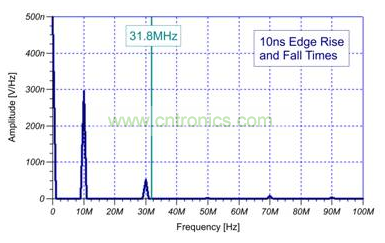 10 ns 邊緣率時方程式結(jié)果為約 31.8 MHz。曲線圖顯示,最后一次明顯諧波出現(xiàn)在30 MHz。同時,圖 2 所示 1 ns 邊緣率時方程式結(jié)果為 318 MHz 最大頻率。如果您的電路易受 318 MHz 頻帶內(nèi)產(chǎn)生的頻率影響,則 EMI 諧波可能會使您的電路出現(xiàn)干擾。