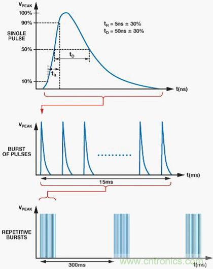 電快速瞬變測試要求將數(shù)個極端快速的瞬變脈沖耦合到信號線上,以代表容性耦合到通信端口的外部開關(guān)電路的瞬態(tài)干擾,這種干擾可能包括繼電器和開關(guān)觸點抖動,以及切換感性或容性負載引起的瞬變,所有這些在工業(yè)環(huán)境中非常常見。EC 61000-4-4中定義的EFT測試嘗試模擬因為這些類型的事件產(chǎn)生的干擾。