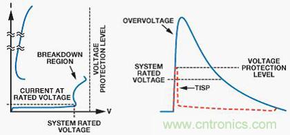 TISP的非線性電壓-電流特性通過轉(zhuǎn)移產(chǎn)生的電流來限制過壓。作為晶閘管,TISP具有非連續(xù)電壓-電流特性,它是由于高電壓區(qū)和低電壓區(qū)之間的切換動作而導(dǎo)致的。圖8顯示了器件的電壓-電流特性。在TISP器件切換到低電壓狀態(tài)之前,它具有低阻抗接地路徑以分流瞬變能量,雪崩擊穿區(qū)域則導(dǎo)致了箝位動作。在限制過壓的過程中,受保護(hù)電路短暫暴露在高壓下,因而在切換到低壓保護(hù)導(dǎo)通狀態(tài)之前,TISP器件處在擊穿區(qū)域。TBU將保護(hù)下游電路,防止由于這種高電壓導(dǎo)致的高電流造成損壞。當(dāng)轉(zhuǎn)移電流降低到臨界值以下時,TISP器件自動復(fù)位,以便恢復(fù)正常系統(tǒng)運(yùn)行。