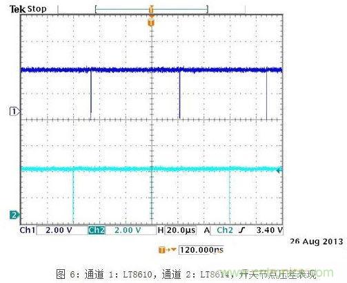 圖 5顯示了13.2V輸入的開關(guān)節(jié)點(diǎn)??梢钥吹剑琇T8614與理想方波的偏離極小,如通道2所示。圖3、4和5中的所有時(shí)間域測量結(jié)果都是用 500MHzTektronixP6139A探頭測得的,封閉的探頭尖端屏蔽罩連接至PCBGND平面,測試均在標(biāo)準(zhǔn)演示電路板上進(jìn)行。[page]