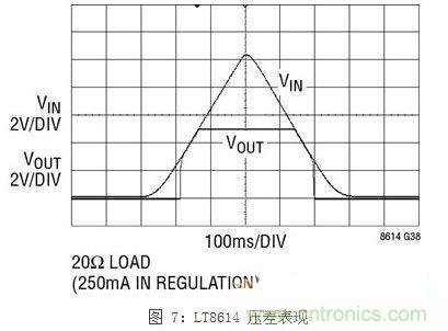 除了面向汽車環(huán)境的42V絕對最大輸入電壓額定值,器件的壓差表現(xiàn)也非常重要。常常需要支持至關(guān)重要的3.3V邏輯電源以應(yīng)對冷車發(fā)動(dòng)情況。在這種情況 下,LT8614SilentSwitcher穩(wěn)壓器保持接近LT861x系列的理想表現(xiàn)。LT8610/11/14器件不是像其他器件那樣提供更高的欠 壓閉鎖電壓和最大占空比箝位,而是以低至3.4V的電壓工作,而且只要有必要,就跳過若干周期,如圖6所示。這樣就產(chǎn)生了理想的壓差表現(xiàn),如圖7所示。