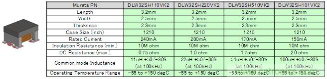 作為DLW43SH系列的小型化產品,DLW32SH系列目前正在開發(fā)中。該系列的外觀以及主要特性如圖3所示。DLW32SH系列的尺寸為3.2×2.5×2.3mm具有小尺寸特點,并且與DLW43SH系列相比,可實現同等性能。其構造的特征是在產品端子部分使用了金屬支架,可以緩和由于溫度變化產生的熱伸縮影響,適用的溫度范圍達到了-55~+150℃。