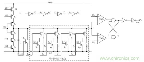 從(4)式可以看出,可以通過改變電容 Cc、充放電電流I 和電壓差值 BG2- BG1能夠?qū)崿F(xiàn)任意頻率的振蕩器。本文中所設(shè)計(jì)的周期性頻率抖動振蕩器的中心頻率為100 kHz,抖動范圍為±4 kHz。