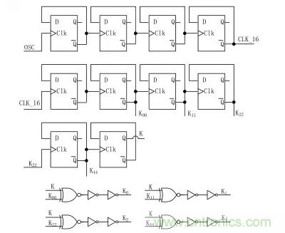 本文中所設(shè)計(jì)的頻率抖動控制模塊是通過計(jì)數(shù)器來控制圖 2 中 M6~ M12開關(guān)管的通斷來周期性的改變充放電電容的大小來實(shí)現(xiàn)的。頻率抖動控制模塊的電路圖如圖 3 所示,由7 個(gè) D 觸發(fā)器串聯(lián)構(gòu)成 512 分頻觸發(fā)器,第 8 個(gè) D 觸發(fā)器的輸出信號加入到異或門用于實(shí)現(xiàn)計(jì)數(shù)器 K4,K2,K1,K0加減法計(jì)數(shù)切換,保證加入到張弛振蕩器中的電容不會出現(xiàn)瞬時(shí)的大容值的變換,從而引起振蕩器的振蕩頻率有過大的變化。本文中所設(shè)計(jì)振蕩器的中心頻率為100 kHz,頻率抖動范圍為±4 kHz,頻率從 96 kHz,100 kHz,104 kHz 周期性地變化,頻率抖動周期為 5 ms。