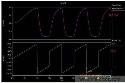 2、仿真CCM模式,磁滯回線上會出現(xiàn)兩個安匝跳變位置,但是磁通密度并不能跳變,而是通過下降來釋放能量。