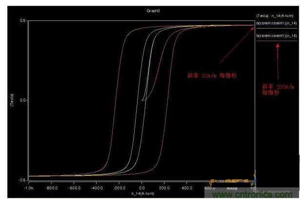 用三角波仿真了下磁芯,磁滯回線方正了很多,也不會因為正弦規(guī)律產(chǎn)生嚴重的拖尾效應。圖2是同頻率不同幅度。圖3同斜率不同幅度的。