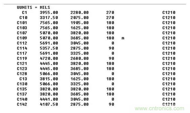 大家可以清晰可以的看到第一行表示的是單位mil。第一列是器件位號(hào),第二列是X軸坐標(biāo),第三列是Y軸坐標(biāo),第四列是旋轉(zhuǎn)度數(shù),第五列是表示器件放在top面(空白)或者bottom面(m-Mirror的縮寫),第六列是器件封裝名。對(duì)于一個(gè)器件的定位信息來說,直接 感覺一下,似乎我們只需知道是哪個(gè)器件也就是器件位號(hào),放置在哪一面,也就是在表面還是底面,旋轉(zhuǎn)度數(shù)以及具體的xy坐標(biāo),信息就全了。對(duì)于是哪種封裝類型似乎不是必需的,那么說到這,我想大家也就明白在遇到上述情況時(shí),可以進(jìn)行一些更為簡(jiǎn)單的操作了。