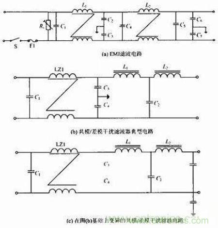開關(guān)電源對內(nèi)、外的干擾及抗干擾中,共模信號與開關(guān)器件的工作方式、散熱器的安裝及整機(jī)PCB板與機(jī)殼的連接有相當(dāng)復(fù)雜的關(guān)系,共模信號在一定 的條件下又可轉(zhuǎn)變成差模信號。其中解決共模干擾除了上述一般的EMI濾波電路,還可按如下電路圖的思想在電路上改進(jìn),使開關(guān)電源能夠在電路上改進(jìn)從而提高 性能。圖1(b)為共模/差模干擾濾波器典型電路,圖1(c)為在圖1(b)基礎(chǔ)上變異的共模/差模干擾濾波電路。