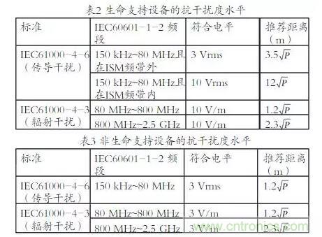 在IEC 60601-1-2《醫(yī)用電氣設(shè)備第1-2部分:安全通用要求并列標準:電磁兼容要求和試驗》中,規(guī)定了對生命支持設(shè)備和非生命支持設(shè)備的電磁抗擾度,他們的抗干擾水平分別為10 V/m和 3V/m 。生命支持設(shè)備主要指呼吸機、血透機等對維持患者生命起著關(guān)鍵作用的醫(yī)療設(shè)備,相較于非生命支持設(shè)備,這類設(shè)備的安全性能要求更為嚴格,抗電磁干擾水平也高于非生命支持設(shè)備。在IEC61000-4-3《電磁兼容性(EMC)第4-3部分:測試及測量技術(shù)—放射性、射頻式、電磁場抗干擾度試驗》針對所有電子電氣設(shè)備的電磁兼容標準中,醫(yī)療設(shè)備屬于其中的水平等級3和水平等級2。低頻率的干擾主要來源于傳導(dǎo)發(fā)射產(chǎn)生的干擾電壓;而高頻率的干擾主要來源于輻射發(fā)射產(chǎn)生的電磁干擾場強。同時在IEC60601-1-2標準中,也給出了在電磁環(huán)境中醫(yī)療設(shè)備抗干擾度的推薦距離,在相同的發(fā)射功率下,生命支持設(shè)備的抗電磁干擾水平要高于非生命支持設(shè)備,推薦距離也相對較遠,如表2~3所示。