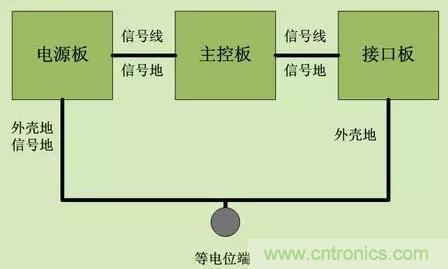 靜電要得到有效釋放,就要保證良好的接地。對于醫(yī)療電子,一般的醫(yī)療電子產(chǎn)品比如監(jiān)護(hù)儀,機(jī)身后面都會(huì)有一個(gè)等電位接地端。在做ESD試驗(yàn)的時(shí)候,這個(gè)接地 端也是要接大地的,這樣就有了一個(gè)靜電快速泄放的途徑。如圖5.1,假如主電路板分為三個(gè)模塊:電源板,主控板和接口板,接口板的接口外殼地要和信號地分 開,然后接口板的外殼地和等電位端用粗導(dǎo)線相連。系統(tǒng)的信號地可以從電源板的外殼地與信號地相連然后共用一根粗導(dǎo)線與等電位端相連。之所以沒有采用每塊板 都分別接到等電位端的星形接地方法,是因?yàn)樾切谓拥貢?huì)形成接地環(huán)路,從而增加射頻噪聲和容易受電磁干擾。