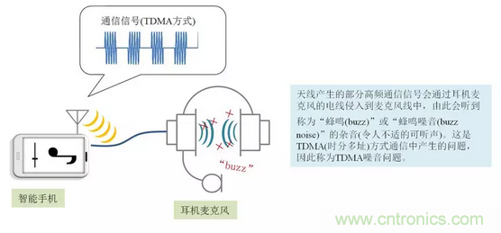 通信電波的高頻信號(hào)侵入到麥克風(fēng)線中時(shí),揚(yáng)聲器會(huì)發(fā)出稱為"蜂鳴(buzz)"或"蜂鳴噪音(buzz noise)"的雜音(令人不適的可聽聲)。由于以前在TDMA(時(shí)分多址)方式的電話中出現(xiàn)過重大問題,因此普遍稱為TDMA噪音。圖1所示為在智能手機(jī)中連接耳機(jī)麥克風(fēng)時(shí)產(chǎn)生TDMA噪音事例的示意圖。進(jìn)行蜂窩通信時(shí),高頻信號(hào)侵入到麥克風(fēng)線中導(dǎo)致產(chǎn)生TDMA噪音。
