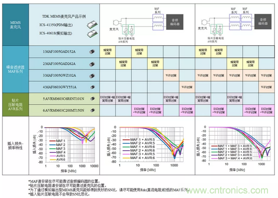 圖4所示為噪音濾波器MAF系列與貼片壓敏電阻的麥克風(fēng)線噪音對(duì)策事例及其效果。