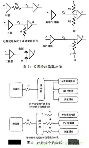 為了抑制出現(xiàn)在印制線終端的反射干擾,除了特殊需要之外,應(yīng)盡可能縮短印制線的長(zhǎng)度和采用慢速電路。必要時(shí)可加終端匹配。終端匹配方法比較多,常見(jiàn)終端匹配方法見(jiàn)圖3所示。根據(jù)經(jīng)驗(yàn),對(duì)一般速度較快的TTL電路,其印制線條長(zhǎng)于10cm以上時(shí)就應(yīng)采用終端匹配措施。匹配電阻的阻值應(yīng)根據(jù)集成電路的輸出驅(qū)動(dòng)電流及吸收電流的最大值來(lái)決定。時(shí)鐘信號(hào)較多采用串聯(lián)匹配,見(jiàn)圖4所示。