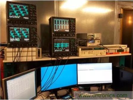 圖2:在EMC干擾室外用于抗干擾數(shù)據(jù)動(dòng)態(tài)分析的示波器陣列