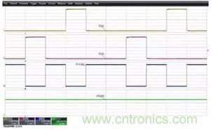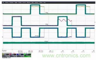 下圖3顯示的是關(guān)閉模板后示波器采集到的數(shù)據(jù)信號(hào),每個(gè)信號(hào)的波形形狀可以被清晰的顯示和觀察。示波器基于通道2的邊沿觸發(fā),所有4個(gè)波形同時(shí)被捕獲。