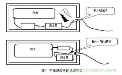 主要考慮(1)抑制工作頻帶以外的干擾;(2)在信號電路中用吸收濾波器消除無用的頻譜成分;(3)在電源電路(尤其是開關(guān)電源中),操縱電路,控制電路,以及轉(zhuǎn)換電路中消除產(chǎn)生的干擾。在工程實際中,一個最值得注意的地方是電源濾波器的安裝,常見的濾波器的錯誤安裝如圖2所示。