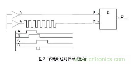 (3)保證信號在PCB上可靠的傳輸,確保信號的完整性。這里面主要的問題一般包括時延、阻抗不匹配、地彈跳、串音等。這不但影響到電子器件的穩(wěn)定工作,還會產(chǎn)生電磁干擾。一般在高速邏輯設(shè)計中最容易碰到時延問題,處理不好會產(chǎn)生不希望的脈沖干擾。傳輸時延對信號的影響如圖5所示。