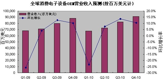 下圖所示為iSuppli公司對于各季度全球消費電子設(shè)備營業(yè)收入的預(yù)測。
