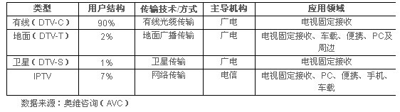 根據(jù)不同傳輸方式,中國DTV主要分為有線數(shù)字電視、地面數(shù)字電視、衛(wèi)星數(shù)字電視以及IPTV四種類型。(傳統(tǒng)意義上數(shù)字電視分有線、地面及衛(wèi)星三種類型。但AVC認為,從應(yīng)用角度來講,IPTV是數(shù)字電視的一種特殊表現(xiàn)形式,故將IPTV也列入比較之列)