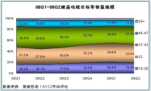 受終端售價(jià)快速下降至3000元以內(nèi)及家電下鄉(xiāng)政策因素的拉動(dòng),32英寸及以下規(guī)格在LCD零售內(nèi)部比重顯著提升;40/46陣營受42vs40和47vs46均價(jià)傾壓及上游面板廠供銷策略的影響,在一季度銷量比重有所下降,二季度比重有所提升。