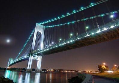 諸如尺寸小、使用壽命長、功耗低、易于調(diào)光和快速接通時間等好處已經(jīng)加速了高亮度LED在工業(yè)和住宅照明等很多已有照明應(yīng)用中被采用。LED的長壽命和小尺寸使得在各種應(yīng)用中引入新配置成為可能,這些應(yīng)用包括在冰箱正面提供照明的白光LED陣列、以至照亮整個大學(xué)校園的更復(fù)雜系統(tǒng)等。以下圖顯示的是美國紐約Verrazano Narrows大橋,這個大橋完全由高亮度LED照明。LED的高效率極大地降低了所需的電力,而它們的長壽命和耐用性在相對苛刻的海洋環(huán)境中尤其重要。