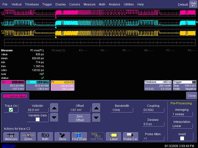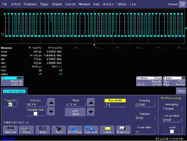 我們知道,帶寬的限制對(duì)信號(hào)的捕獲會(huì)帶來(lái)下面的影響:1,使被測(cè)信號(hào)的上升沿變緩。2,使信號(hào)的頻率分量減少。3,使信號(hào)的相位失真。 那么,“對(duì)于5MHz的時(shí)鐘信號(hào),需要用多少帶寬的示波器來(lái)測(cè)量?” 這是我在培訓(xùn)時(shí)常問的一個(gè)問題。我很少能得到令我滿意的答案,很少有工程師反問我:“這5MHz的時(shí)鐘信號(hào)是方波還是正弦波,如果是方波,其上升時(shí)間是多少?” 我常得到的回答是,“100MHz帶寬就足夠了,示波器帶寬通常是被測(cè)信號(hào)頻率的3-5倍,100MHz余量很大了。” 圖13顯示了5MHz的方波信號(hào)在不同帶寬時(shí)測(cè)試出的波形。其中,M1和M2是分別在6GHz和1GHz時(shí)波形,C3是帶寬限制到200MHz的測(cè)試結(jié)果。 圖14顯示在帶寬限制到200MHz時(shí)測(cè)量出的5MHz的上升時(shí)間均值為本1.70357ns,而圖15顯示的是在6GHz帶寬時(shí)的上升時(shí)間為873.87ps。這表明,對(duì)于 5MHz的時(shí)鐘,因?yàn)槠渖仙龝r(shí)間比較快,最好用1GHz以上帶寬的示波器來(lái)測(cè)量其上升時(shí)間,200MHz時(shí)其上升沿變緩; 1GHz帶寬和6GHz帶寬對(duì)于測(cè)試800ps的上升時(shí)間結(jié)果幾乎一樣。