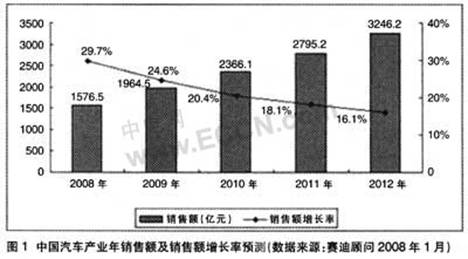 中國汽車產(chǎn)業(yè)的繁榮直接帶動了汽車電子產(chǎn)業(yè)的迅速崛起。中國汽車產(chǎn)業(yè)近幾年快速發(fā)展,2007年產(chǎn)量達(dá)到近888.24萬部,僅次于日本和美國,成為世界第三大汽車生產(chǎn)國。下游應(yīng)用市場的快速增長對汽車電子產(chǎn)業(yè)的發(fā)展起到巨大的推動作用。