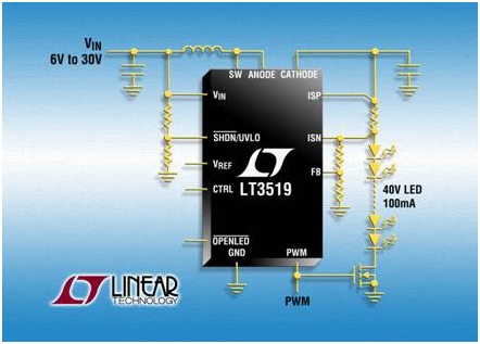 LT3519 在 LED 的高端檢測(cè)輸出電流,從而可實(shí)現(xiàn)降壓、降壓-升壓或升壓型配置。結(jié)合傳統(tǒng)電壓反饋和獨(dú)特的浮動(dòng)電流檢測(cè)反饋,這些轉(zhuǎn)換器可以作為恒定電壓或恒定電流源工作,從而提供最大的設(shè)計(jì)靈活性。其它特點(diǎn)包括:開路 LED 保護(hù)、軟啟動(dòng)和熱保護(hù)。