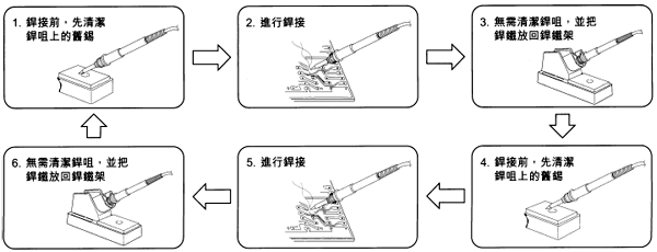 這可以減低烙鐵頭的氧化機(jī)會(huì),使烙鐵頭更耐用。使用后,應(yīng)待烙鐵頭溫度稍為降低后才加上新焊錫,使鍍錫層有更佳的防氧化效果。(圖5)