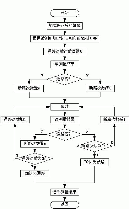 為了消除電容元件和模擬開關(guān)抖動的影響需要延長測量時間,而要消除電感元件的影響,則要利用感生電動勢在很短時間內(nèi)確定,為此程序中設(shè)置了兩個計數(shù)器:通路次數(shù)計數(shù)器和斷路次數(shù)計數(shù)器。設(shè)置通路次數(shù)N是為了消除模擬開關(guān)閉合瞬間由于電容充電產(chǎn)生的假通路影響,即當(dāng)累計讀得N次通路結(jié)果時,一般對電容的充電已結(jié)束,才確認(rèn)被測量點間為通路。設(shè)置斷路次數(shù)n是為了排除模擬開關(guān)抖動所引起的干擾,一般在連續(xù)測得n次斷路結(jié)果時表明模擬開關(guān)的抖動已經(jīng)結(jié)束,才能確認(rèn)為斷路。但因為電感的感生電動勢在模擬開關(guān)閉合瞬間最大,隨后迅速下降,所以如果第一次和第二次測量結(jié)果都為斷路,則確認(rèn)為斷路。由于幾種情況之間互相矛盾,計數(shù)器及延時的值是在權(quán)衡三種情況的基礎(chǔ)上根據(jù)實際情況確定的。
