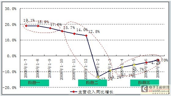 2008年三季度,受全球金融危機(jī)的影響,中國電子信息產(chǎn)業(yè)出現(xiàn)下滑趨勢。7-8月,主營收入增長率下滑0.2個百分點,8-9月,增長率下滑1.3個百分點。進(jìn)入第四季度,下滑幅度開始增大,9-10月,增長率下滑了1.9個百分點,至2009年2月,主營收入增長率跌至最低點。從2009年2月電子信息產(chǎn)業(yè)振興規(guī)劃獲得通過,4月振興規(guī)劃正式發(fā)布到7月期間,伴隨著“家電下鄉(xiāng)”,“汽車下鄉(xiāng)”、調(diào)整出口退稅稅率等政策相繼實施,振興規(guī)劃對電子信息產(chǎn)業(yè)的提振效應(yīng)開始顯現(xiàn)。賽迪顧問研究數(shù)據(jù)顯示,從2009年4月起,電子信息產(chǎn)業(yè)經(jīng)濟(jì)運行開始出現(xiàn)企穩(wěn)跡象,主營收入降幅趨緩,并逐漸開始走出低谷。