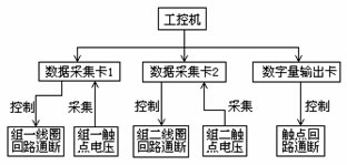 需要注意的是,當(dāng)觸點(diǎn)電壓為交流信號(hào)時(shí),為了保證電壓有效值的計(jì)算精度,采集卡在一個(gè)工頻周期內(nèi)要完成16個(gè)采集通道至少320次的AD轉(zhuǎn)換,這就要求采集卡的采集速率非???,本裝置采用的是研華的PCL-818HG。每塊采集卡還提供了一個(gè)20-PIN數(shù)字輸出口,用來(lái)控制試品線圈回路的通斷電。試品觸點(diǎn)回路采用一塊多通道的數(shù)字量輸出卡,通過(guò)固態(tài)繼電器實(shí)現(xiàn)對(duì)兩組試品觸點(diǎn)回路的通斷電控制。繼電器可靠性檢測(cè)裝置的結(jié)構(gòu)框圖如圖1所示。