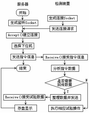 最后,通信結(jié)束后,通過(guò)CAsyncSocket::Close()函數(shù)銷(xiāo)毀對(duì)象。服務(wù)器與檢測(cè)裝置的通訊流程見(jiàn)圖3。