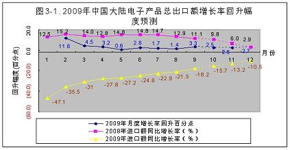 2008年下半年,國際金融風(fēng)暴席卷全球,以出口為主導(dǎo)的中國大陸電子信息產(chǎn)業(yè)直接受到?jīng)_擊,產(chǎn)品進(jìn)出口受阻,導(dǎo)致產(chǎn)品產(chǎn)量不斷下降,到今年元月份下降到谷底。由于中國政府及時實行積極的財政政策,調(diào)整產(chǎn)品結(jié)構(gòu),努力擴(kuò)大內(nèi)需,電子信息產(chǎn)業(yè)從2月份開始逐漸回升。雖然在個別月份有所波動,但回升趨勢穩(wěn)定向好。預(yù)計2009年全行業(yè)能實現(xiàn)5%左右的增長;進(jìn)出口額雖然有較大幅度的回升,但仍將呈現(xiàn)負(fù)增長;由于政府積極擴(kuò)大內(nèi)需,國內(nèi)市場將繼續(xù)保持10%左右的較快增長。